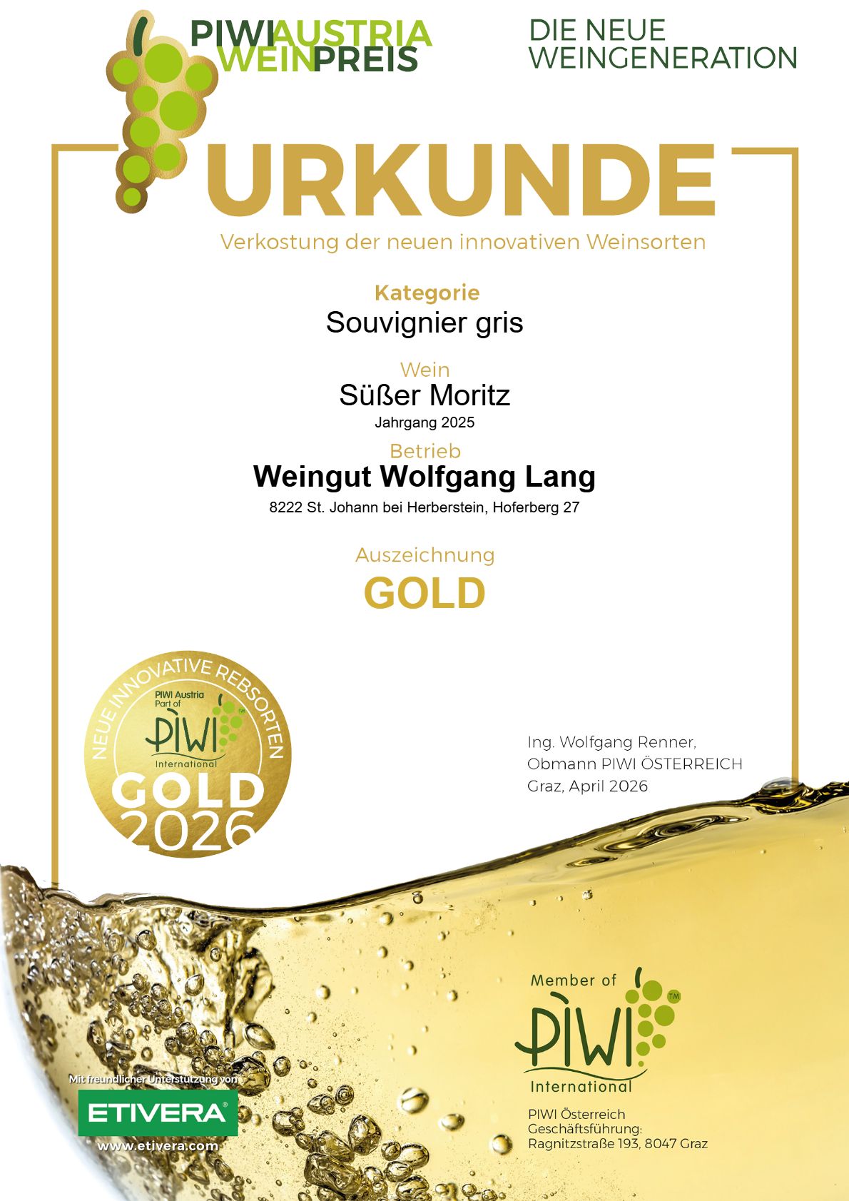 2026 bekommt unser Süßer Moritz eine neue Handschrift: Heuer haben wir Souvignier Gris /25 süß ausgebaut. Etwas kräftiger – wie unser Enkerl – aber immer noch ebenso zuckersüß.